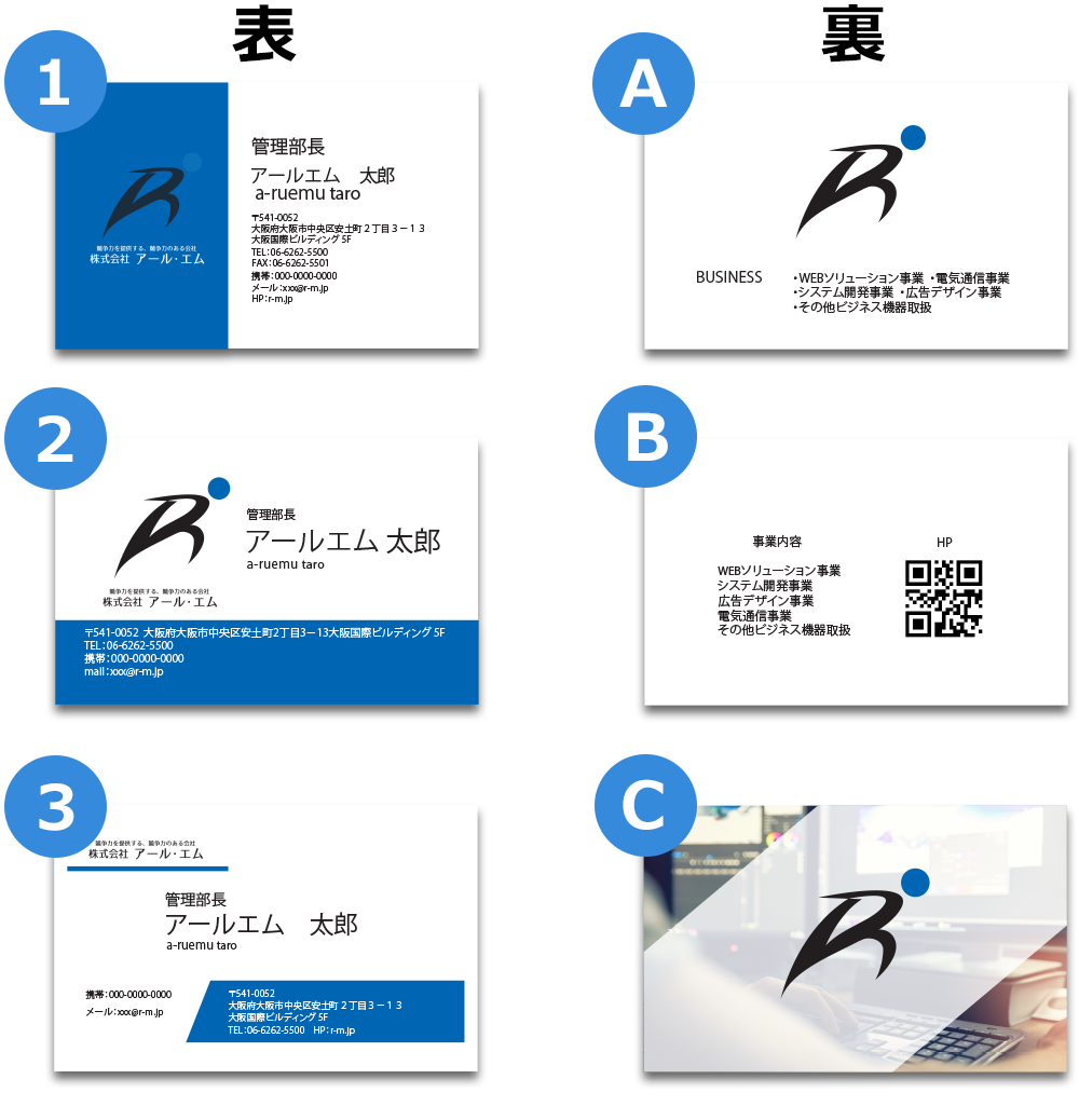 表裏1パターンずつお選びいただき、1つの名刺を作成できます。